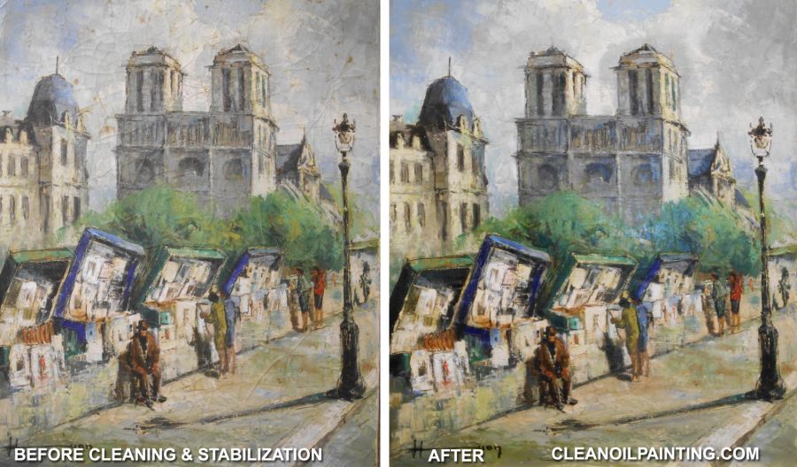 The middle photo shows the painting during the cleaning process. Note the color of the sky and cobblestone street on the left side of the painting.